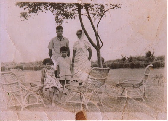Here’s a picture of my parents, early in their marriage, with their first two children, Baba and Muna. I think the photo was taken in the early 1960s at the Dumlotti farm, outside of Karachi. You can sort of see from the landscape that it is flat and desert like.